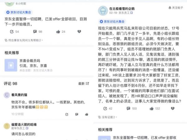 有人表示京东已经暂停了一切招聘,已经发出的 offer 也在收回。可能在有些部门,这种情况确实存在,也有人在下面评论称,他已经通过了京东的面试,本来已经要发 offer 了,但又通知他“ HC 没有了”。