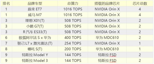 2022高级辅助驾驶车辆算力排行 T为根据公开消息推测