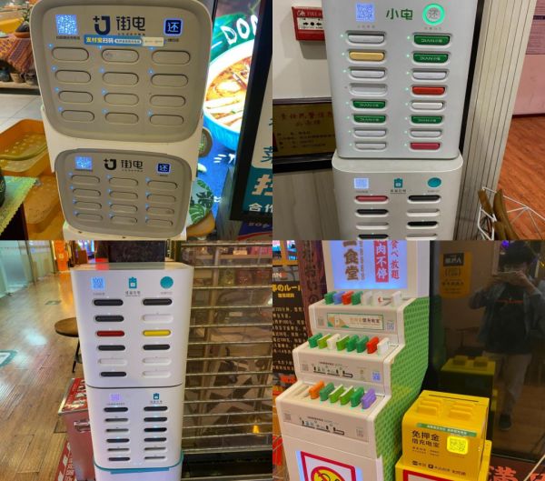 在火车站、商圈、便利店等地,共发现了街电、搜电(现已合并为竹芒科技)、小电、来电、怪兽充电、美团6个品牌。