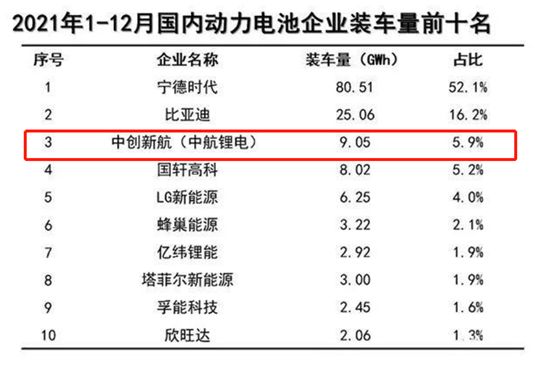 据中国汽车动力电池产业创新联盟数据显示,2021年,中国动力电池装车量累计154.5GWh,其中中创新航装机量为9.05GWh,仅次于宁德时代、比亚迪,位列中国第三,全球第七。按照2022年1月的装机量计算,中创新航已跃居全球动力电池企业第六。