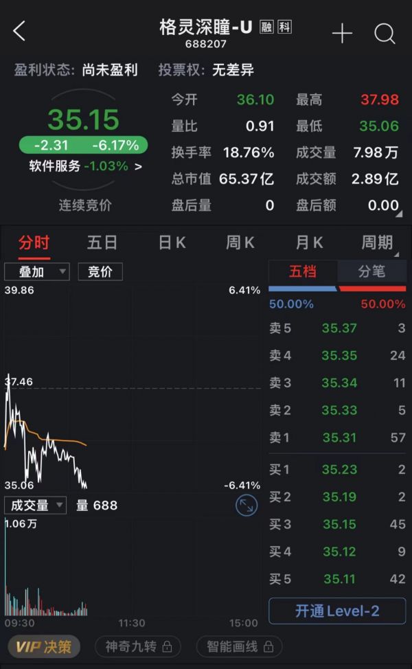 本周,一家AI概念明星公司在科创板成功上市了。3月17日,北京格灵深瞳信息技术股份有限公司(简称“格灵深瞳”,688207.SH)在上交所科创板上市。该股首日开盘就破发,上市首日收盘报37.46元,跌幅5.14%,成交额10.06亿元,换手率64.14%,振幅15.85%,总市值69.29亿元。截至本文发稿,格灵深瞳的股价仍在持续下跌之中。