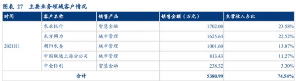 更加细分来看,公司的主要客户为农业银行、东方网力、朝阳农委、中国联通上海分公司和中金银利,前五家大客户的销售收入在公司总体销售收入中占比达到了75%。