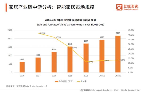 据艾瑞咨询数据显示,2020年中国智能家居市场规模同比增长11.4%至1705亿元。预计到2022年将突破2000亿元。