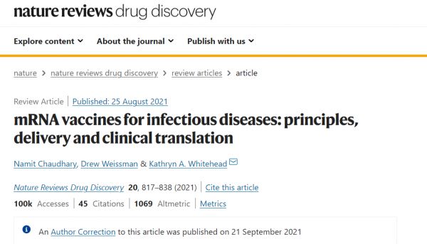 针对 Covid-19 的 mRNA 疫苗有效性已被证实,目前为止,传染病仍是mRNA技术最有前景的领域。