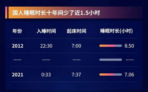 过去十年,中国人的入睡时间推迟了两个小时,睡眠时间缩短了一个半小时。2021年,中国人的平均睡眠时长仅有7.06小时,无论按照什么标准都太短了。