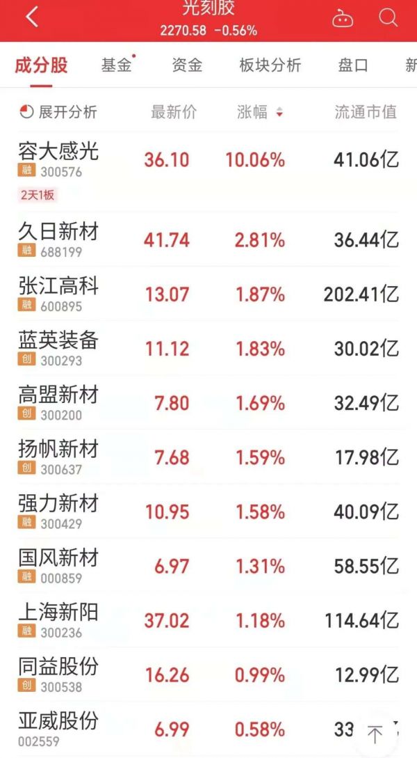 本次日本地震消息传出后,国内光刻胶概念股掀起涨停潮,板块指数最高大涨近8%,容大感光、格林达、彤程新材、江化微等涨停,南大光电、晶瑞电材等涨幅近9%。