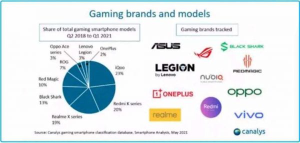 Canalys发布的2018年第二季度至2021年第一季度期间各大游戏手机品牌的市场份额榜单显示,在大厂旗下普通游戏手机之外,行业默认的四大专业游戏手机品牌黑鲨、红魔、ROG、拯救者,四者市场份额之和仅为33%。在这四大品牌中,黑鲨排名第一,拥有13%的占有率。