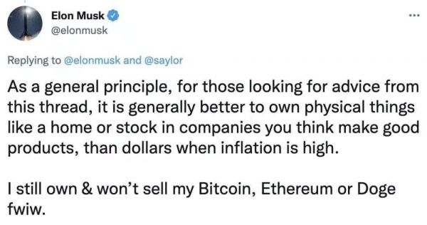 在前几天的推文中,马斯克除了呼吁公众购买实体资产外,还强调“我仍然拥有,并且无论如何不会出售我的比特币、以太坊和狗狗币”,三个虚拟币价格应声上涨。