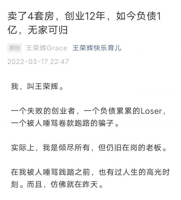 不过,疫情反复之下,“在生死存亡线上挣扎了将近三年”的王荣辉已然无力。她承认了失败,并在文章中强调,“我不会跑路,不会躲避。只要我活着,我就会努力偿还一切我该偿还的债务。”