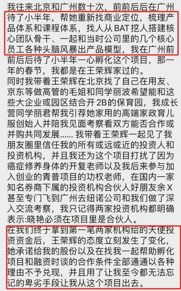 但在拿到第一笔两家机构的天使投资资金后,“王荣辉的态度立刻发生了变化,承诺给我的股份以及找我一起帮忙孵化项目和融资时谈的合作条件全部通通不予兑现,并且用了让我至今都无法忘记的卑劣手段让我从这个项目出去。”