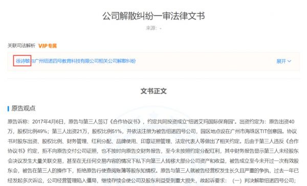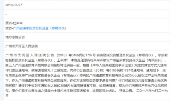 据天眼查资料,杜荣荣曾于2018年7月向广州市天河区人民法院主张将广州纽诺家投资合伙企业(有限合伙)持有的广州纽诺教育科技有限公司30万元股权过户至杜荣荣名下。徐诗敏在法律文书中描述的遭遇也基本与李晓艳爆料一致。