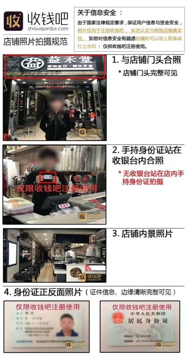 6月2日,记者在“收钱吧”官网填写了商户开通申请并咨询客服人员后,一位员工提出加记者微信沟通。该员工告诉记者,开通需要五份材料:申请人身份证正、反面照片,申请人与店铺门头合照一张,店铺内景照一张,申请人在店里手持身份证拍一张照,以及收款银行卡的正面照片。