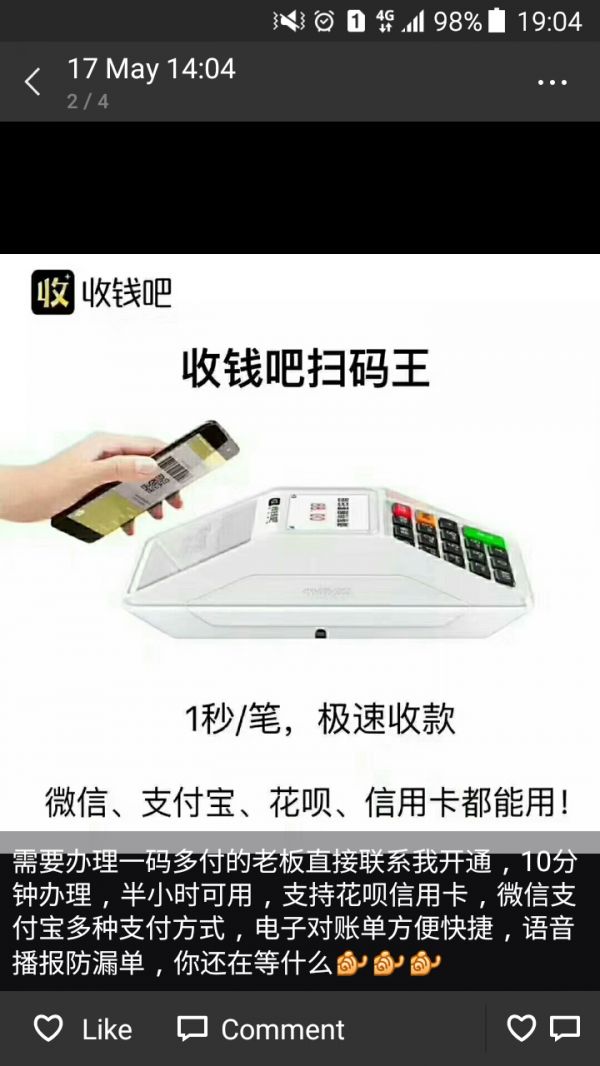 行业的激烈竞争在记者接触的“收钱吧”员工身上也有所反映。记者咨询开户事宜后,该员工多次催促记者筹备材料提交。其朋友圈内发布的状态,也几乎都与销售产品有关,例如“物料整装待发,各位资料准备得怎么样了!”“周六正常上班,需要办理的商户联系我发资料即可”等。