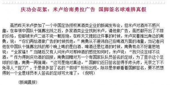 著名篮球专家苏群老师也因此回忆了一件往事:那时候(编者注:国足冲入世界杯决赛圈)搞足球的人扬眉吐气,连8000足记队伍,也都意气风发。不过他们也有犯难的事儿,那就是找球员签名,一个两个无所谓,多了根本签不过来,球员也不干……有一次我在单位午休,门“砰”一声被撞开了,是单位开车的那位兄弟。他气喘吁吁,满头大汗,把一大网兜足球扔地上,少说几十个。然后他先拿了一个签满了名字的足球放床上,又抓了一堆没签过的足球,掏出一支黑色的签字笔,一屁股坐地上,照着那个签过字的足球,龙飞凤舞地签了起来。我大惊失色,说,你这行吗,人家不认出来?他说,放心,我学得像。他又说,没办法,领导下达的任务,要得太多了,国家队怎么签得过来?他们给了一个真的,我照着签,尽量签得像真的一样。