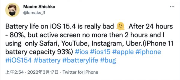 部分用户的反馈他们将手机升级到iOS 15.4后,手机的电池续航时间出现了明显的下滑,有的iPhone 13 Pro Max只能维持半天的续航时间,换算下来可能得一天三充;有的iPhone 11即使亮屏时间只有短短2小时,在24内也损失了80%的手机电量。