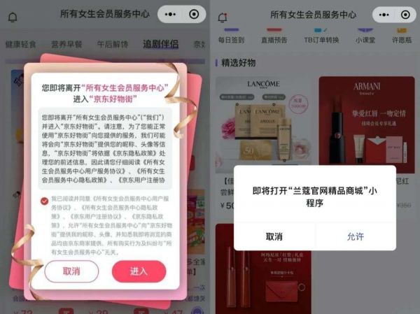 例如,所有女生小程序最近增加了“精选好物”功能,除了可以点击购买商品,小程序还支持跳转至第三方平台或品牌官方小程序下单,如京东好物街、兰蔻、阿玛尼等小程序。