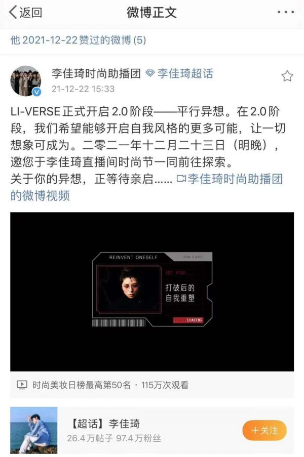 巧合的是,在去年12月20日薇娅被封杀的两天之后,李佳琦时尚助播团官方微博发布了宣传片,表示助播团升级,“正式开启2.0阶段”。