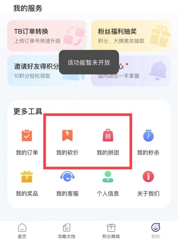 近期所有女生小程序在电商方面的试水,意味着美ONE想在淘宝生态外开拓电商可能。目前,所有女生小程序还有很多功能虽然可见,但是点击后提示“暂未开放”,例如我的砍价、我的拼团等。由此可见,对于做电商、做平台,美ONE起码有了初步的思路。
