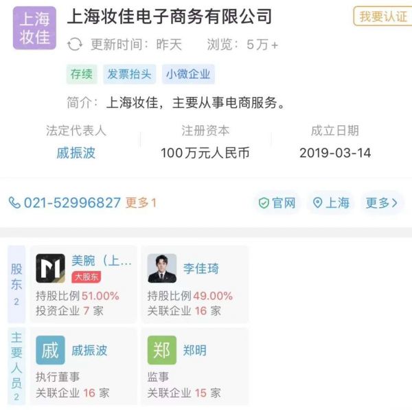 公开信息显示,奈娃家族商标为上海妆佳电子商务有限公司所持有,而该公司是美ONE和李佳琦共同持股的公司,美ONE为大股东,持有51%的股份。