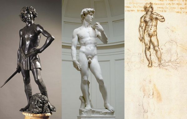 从左至右:维罗基奥的大卫像、米开朗基罗的大卫像、达芬奇对米开朗基罗的研究。