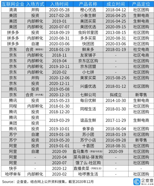 2020年以来,社区团购呈现出巨大的市场诱导力,大量热钱疯狂涌入,滴滴、美团、拼多多、阿里、京东等头部企业扎堆入局,纷纷通过成立事业部或投资的方式参与角逐,投融资布局不断。