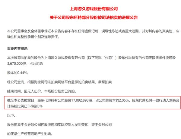 二人频繁质押所持游久游戏股票,在2017年和2018年已基本全部质押。持股又先后经历爆仓、冻结、拍卖。截至2022年2月19日,代琳和刘亮合计持股比例已经降至5%以下。