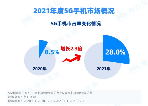 2021年全年,5G手机已经发展为国内手机市场的重要组成部分,各大手机品牌在5G市场的竞争日益激烈。进入2022年,日新月异的5G手机市场又会有怎么样的精彩?每日互动大数据将持续关注5G手机市场的新发展。