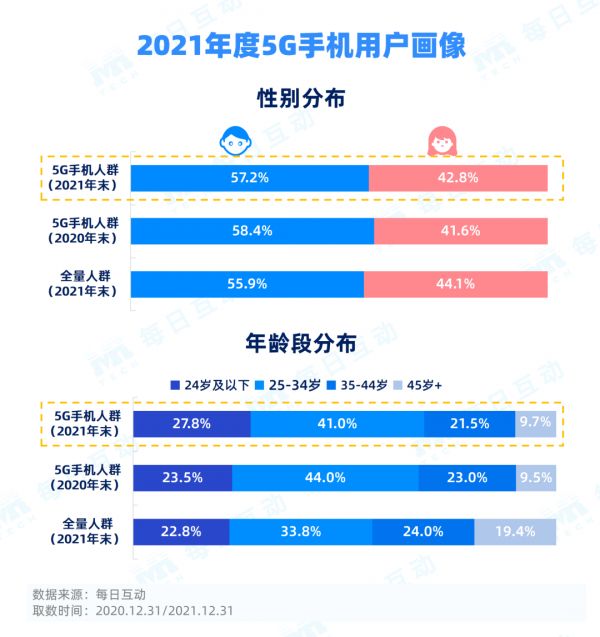 每日互动大数据显示,从性别分布来看,2021年末5G手机女性占比达42.8%。5G手机男女性别比例差距逐渐缩小,正与全量人群的比例趋近。