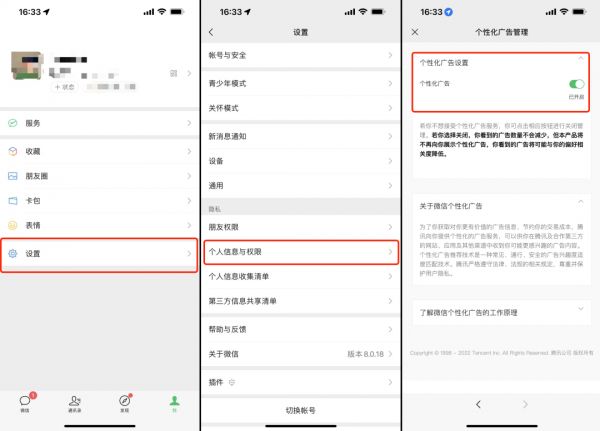 首先是微信,我们要在“我”页面中打开设置选项,然后点击“个人信息与权限”,再点入“个性化广告管理”页面就可以选择关闭微信中的个性化广告。