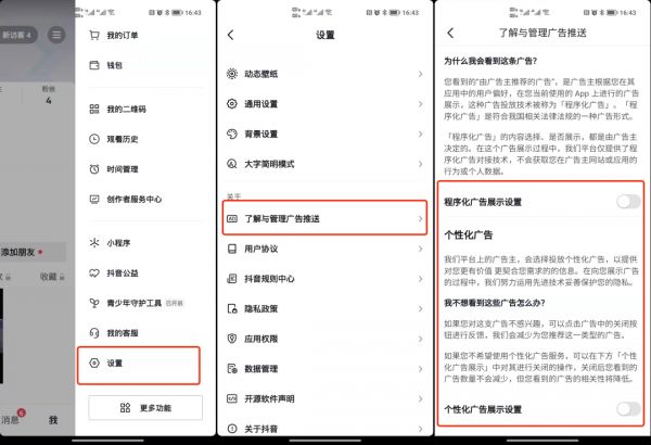抖音的操作步骤则稍稍简单一些,进入到设置页面后,再点击转到“了解与管理广告推送”即可关闭程序化广告展示设置和个性化广告展示。