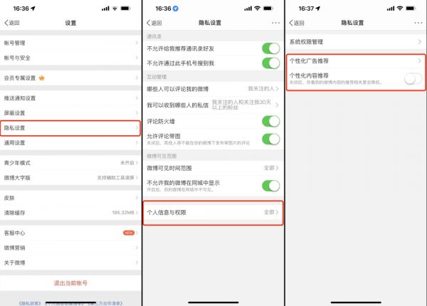 其次是微博,操作大体与微信相同,需要我们进入到设置页面找到“隐私设置”功能,进入后再找到“个人信息和权限”页面,最后选择关闭个性化内容推荐。
