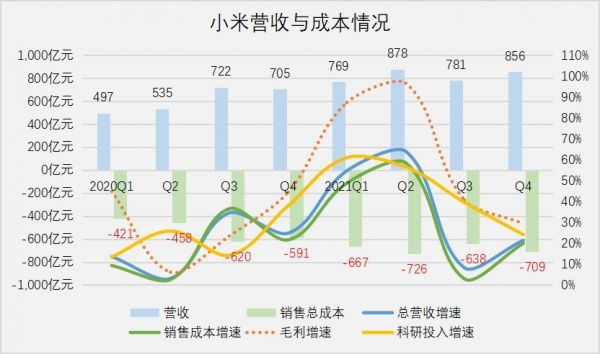 2020年至2021年年初,小米集中在一、二线城市采取自建直营的“千店计划”,迅速推高了销售成本。随着千店计划告一段落,成本将得到有效控制。去年卢伟冰祭出面向下沉市场的“万店计划”,通过授权的轻资产方式扩张,对于未来成本的影响有限。
