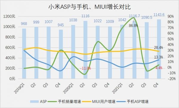 手机ASP是观测小米高端化的核心指标,截至去年第四季度,小米ASP为1143.6元,同比增长13.3%。值得注意的是,最近两年的二季度是小米ASP的峰值,这与复购率的峰值完全重合,说明提升ASP不能靠新用户,只能依靠米粉。