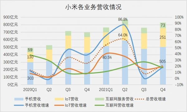 第四季度,小米手机业务实现营收505亿元,同比增长18.4%,IoT营收251元,同比增长19.1%,二者在总营收的权重高达88.3%,全年营收占比为89.2%。值得一提的是,手机业务营收对整体营收的牵引力巨大,但是在毛利率方面却与互联网服务差距不大。