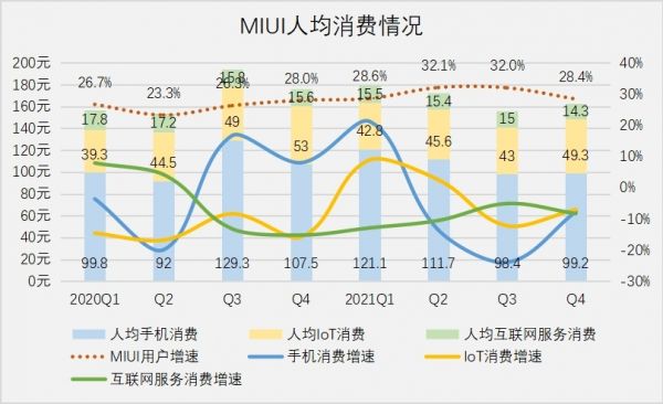 曾几何时,小米每年都能贡献爆款智能设备,近些年却归于平庸,加之IoT策略摇摆不定、生态链企业相继独立,人均IoT消费徘徊在40元左右。尤其去年在小米平板大卖的情况下,人均消费不升反降,这说明购买IoT产品的用户不是MIUI用户,也就意味着他们并不是小米手机用户。
