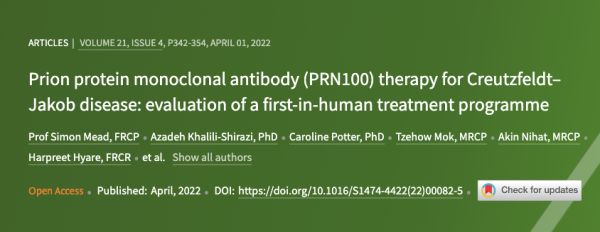 [14]Mead S, Khalili-Shirazi A, Potter C, et al. Prion protein monoclonal antibody (PRN100) therapy for Creutzfeldt-Jakob disease: evaluation of a first-in-human treatment programme. Lancet Neurol. 2022;21(4):342-354. doi: 10.1016/S1474-4422(22)00082-5