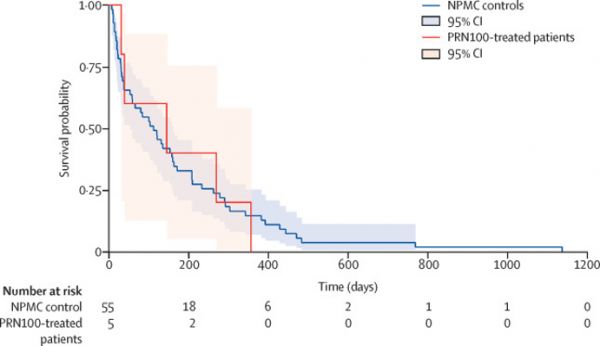 PRN100 治疗的特发性克雅病患者和历史对照组的生存情况对比