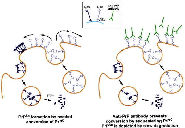 在近年来的研究中,科研人员开始尝试使用药物来降解细胞内已经合成的朊病毒、使用单克隆抗体来阻止朊蛋白本身与朊病毒的结合过程,或者直接抑制人体细胞内天然朊蛋白的合成(朊蛋白在细胞中一般被认为属于「可有可无」的蛋白)。