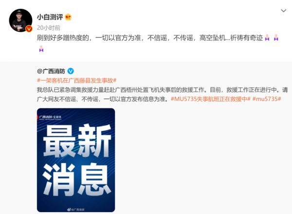 而在此次空难事件中小白测评又一次出现内容争议,大量网友们视其为蹭灾难流量的“惯犯”。3月22日,小白测评公众号已因投诉、涉嫌多种违规,被微信公众平台按照即时通信工具公众信息服务发展管理暂行规定进行阶梯处理,目前已无法在微信中搜索到其账号,但可以搜索到其发布过的文章,已关注用户仍可正常打开和阅读。
