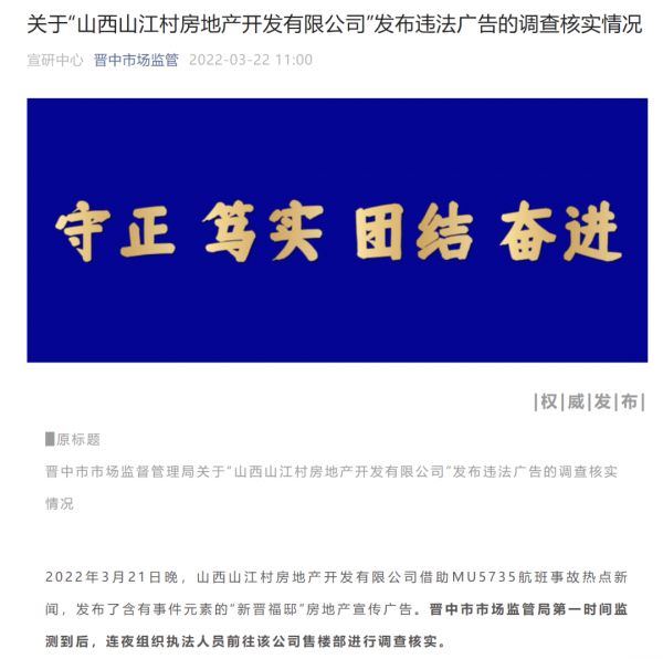 而另一起“灾难营销”事件则更加恶劣,空难发生后,山西山江村房地产开发有限公司借助事故热点新闻,发布了含有事件元素的“新晋福邸”房地产宣传广告,引网友质疑。