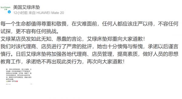 品牌艾绿床垫也在此次灾难中曝出令网友愤怒的一幕。艾绿的一位店员在朋友圈以空难为由发布营销广告:“飞机发生事故,整个朋友圈都火了,你们那么关心人家,怎么就不关心关心自己?”并在该段落后对艾绿的床垫产品进行宣传。