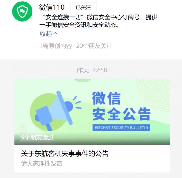 微信安全中心账号“微信110”则在3月21日深夜22:58发出推送,称“发现个别用户利用事件蹭热度、博流量,通过拼凑炒作旧闻,挑起对立情绪,发布不实信息误导公众。”并处理了一批违规账号。