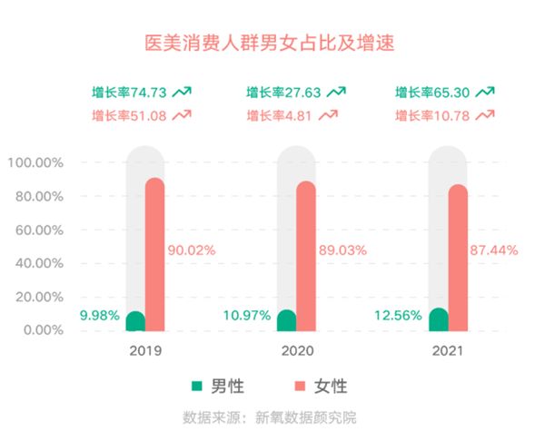 新氧数据研究院发布的一份白皮书里提到,2021年,男性消费者同比增长超过65%,增幅是女性的6倍。