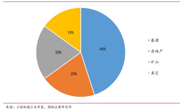 工程机械下游主要是基建、房地产、矿山和其他,需求占比分别为 45%、 20%、20%和 15%。