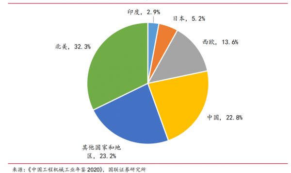 从全球挖掘机需求来看,中国份额仅占全球的22.8%,海外市场是国内的三倍多。