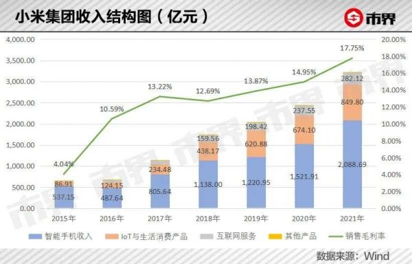 由于毛利率更高的IoT和互联网服务业务收入不断增长,且互联网服务业务的毛利率在2021年有明显提升,导致小米综合毛利率在2021年达到17.75%,为上市以来最高水平。
