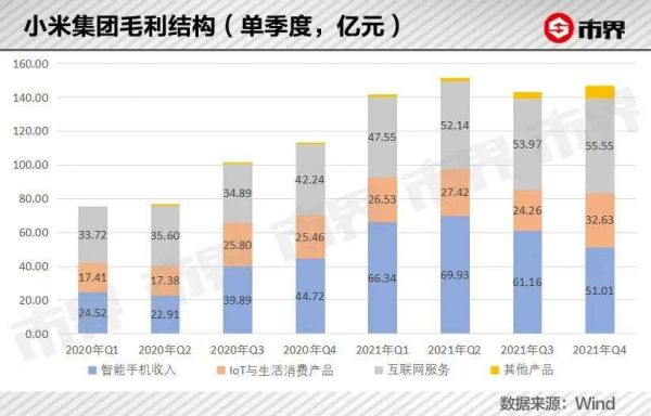 更为具体的数值上,2021年第四季度,小米的互联网服务业务贡献的毛利首次超过了手机业务,二者毛利分别为55亿元和51亿元。