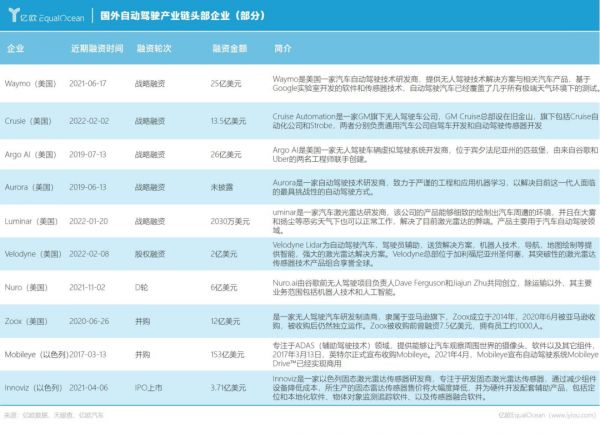 国外自动驾驶市场以Waymo、Crusie等美国企业为首,依托谷歌、通用等互联网企业和车企,在自动驾驶领域深耕已久。