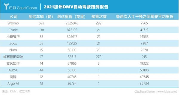 根据2021年加州DMC发布的自动驾驶路测报告,Waymo以23.3万英里的测试里程,稳居榜首。小马智行、文远知行、AutoX、滴滴四家中国企业位居前十。