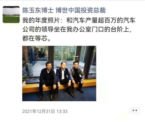 2021年的最后一天,陈玉东在朋友圈发表年度照片,自己和长城、吉利的领导坐在办公室门口等芯,也可见博世对自主品牌的重视。